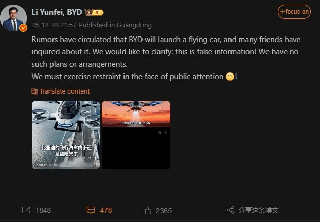 BYD не занимается разработкой летающего автомобиля. После того как в сети появились соответствующие слухи из неназванных источников, китайский гигант заявил, что таких планов у него нет.