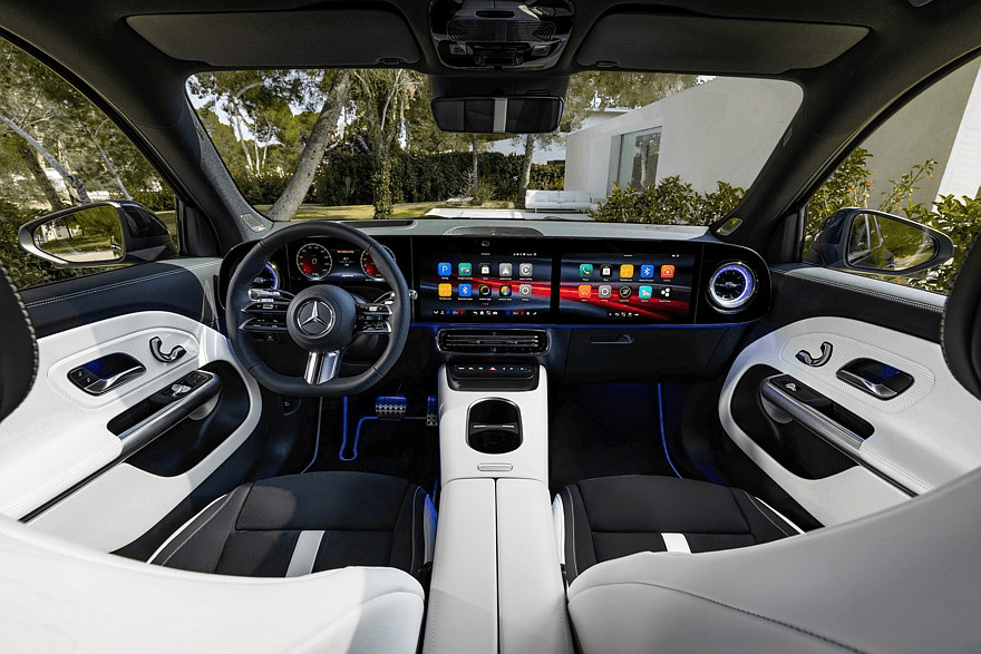 Спереди на панели расположены три дисплея MBUX Superscreen, по бокам которых расположены круглые дефлекторы вентиляции, напоминающие авиационные турбины.
