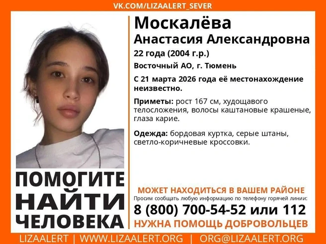 «Днём девушка уехала по делам, но вечером домой не вернулась. Близкие Анастасии забили тревогу и обратились в полицию и отряд. Заявка на поиск 22-летней Москалёвой Анастасии Александровны поступила в отряд 2 апреля 2026 года», — рассказали 72.RU поисковики.